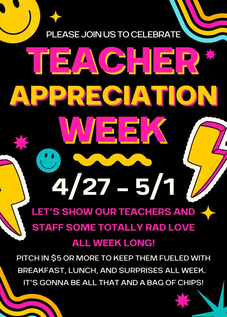 In celebration of Teacher & Staff Appreciation Week, we invite you to help us show our gratitude by contributing toward a special lunch and gift for our amazing teachers and staff. An optional donation of $5 or more is greatly appreciated, and every contribution goes directly toward making this week memorable for them. Thank you for helping us recognize all that they do for our students every day!